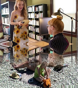 Horny blonde lesbian arranging books then pounded using toys
