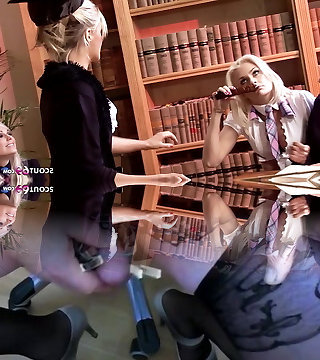 Funny Horny Lesbian College Girl Group Sex in Classroom