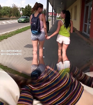 Cute Girl tricked Skinny Classmate to Girl-on-girl Public Hook-up on way home