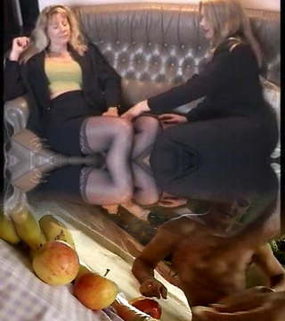 Mature blonde Nina Hartley fingers her hot lesbian lover Elaine Raye before slurping her poon