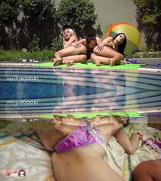 Three sexy Russian lesbians ass-fuck getting off and pussy licking near swimming pool