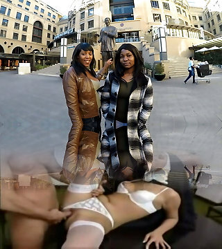 Juicy shaven pussies of the dark-hued lesbians are quivering from happiness when the sex toys come out